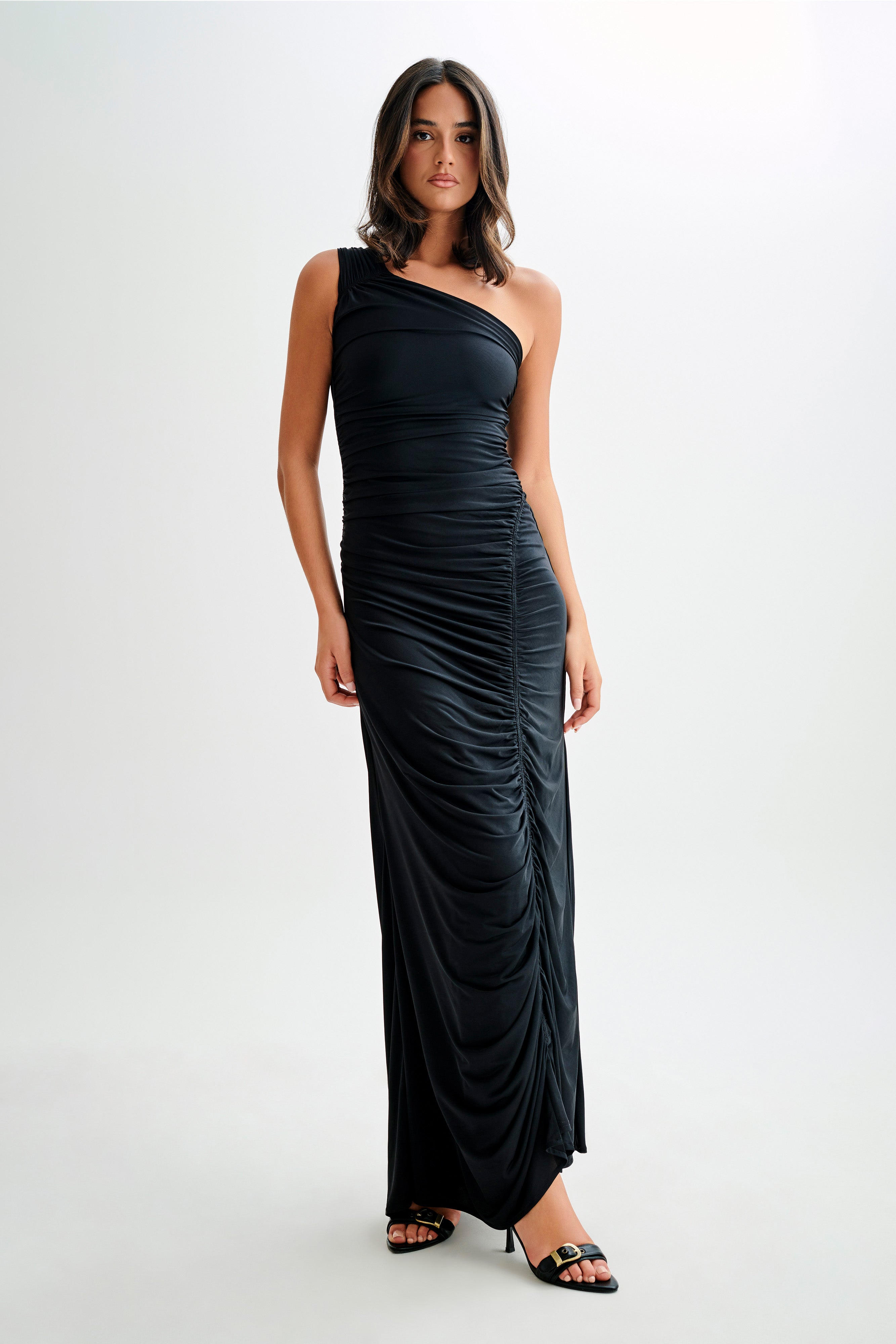 Indulge in timeless glamour with our CAPRI Gathered Slinky Maxi Dress. Designed with an alluring asymmetrical neckline and chic one-shoulder style, this dress is a statement piece for any occasion. The draped shirring detail adds an extra touch of sophistication, while the maxi length elongates your silhouette with effortless grace. Fully lined for comfort and coverage, it's as practical as it is stylish. Whether you're attending a formal event or a casual gathering, this dress promises to make you the epitome of elegance and charm. Elevate your wardrobe with the Capri Maxi Dress and exude confidence wherever you go.