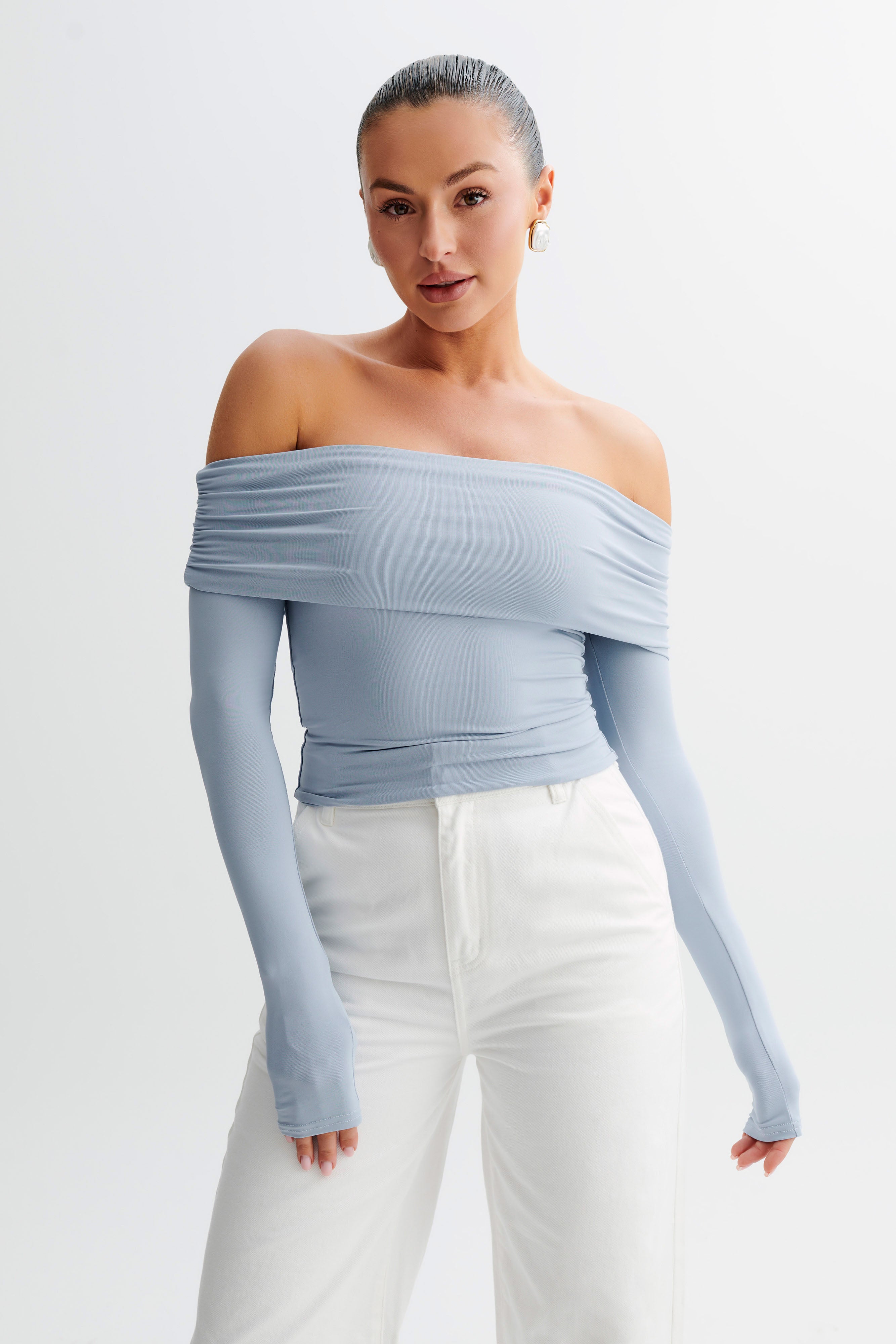 LUCINDA is a long-sleeved off-shoulder top with a ruched neckline and a slightly cropped torso. Cut from comfortable, preferred fibres, it has a semi-bodycon fit that hugs and flatters your curves. A modest piece with a modern design, this top is fresh and versatile.