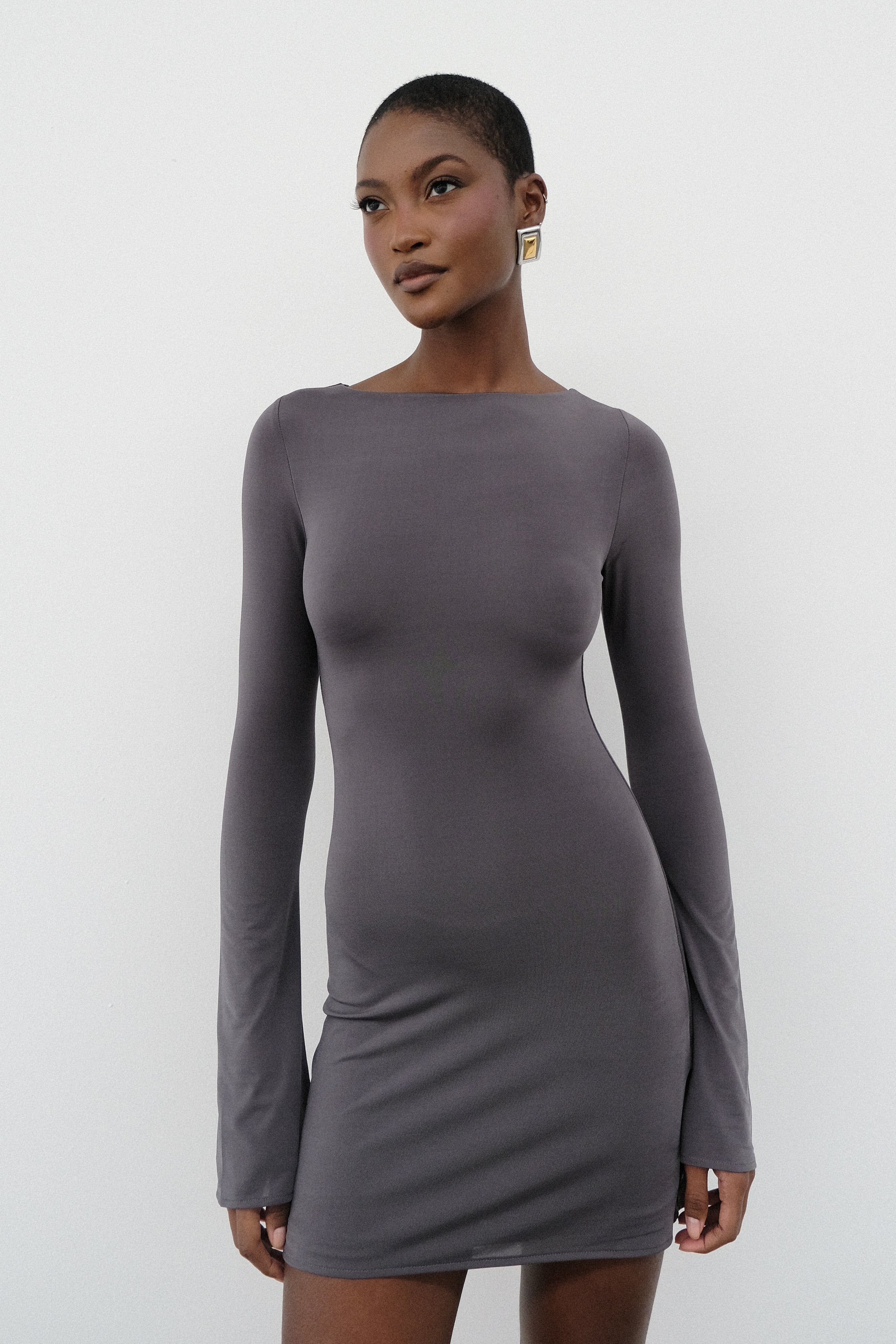 Beautifully body-hugging, TARNA is a slinky mini dress with a boat neckline, flared sleeves, and a classic fishtail hem. Its stretchy material enhances your silhouette in all the best ways. The flared shape of both the sleeves and the hem adds an air of confidence, making this the perfect fit for evening events.